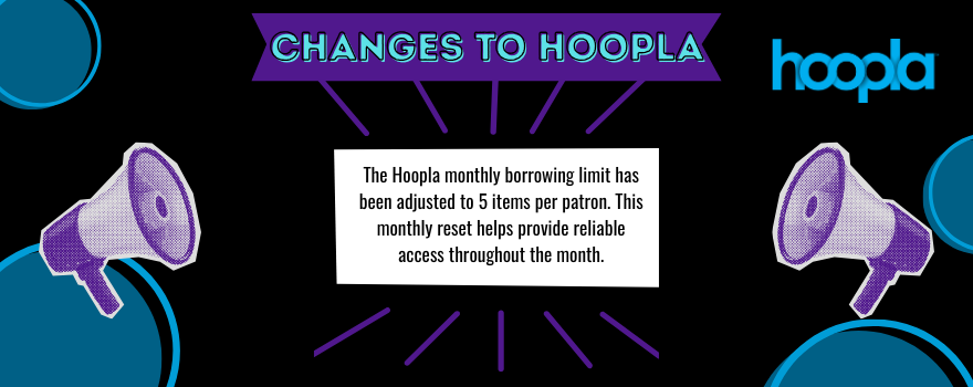 Read more »Changes to Hoopla Update to Monthly Borrowing Limit To help manage costs and ensure continued