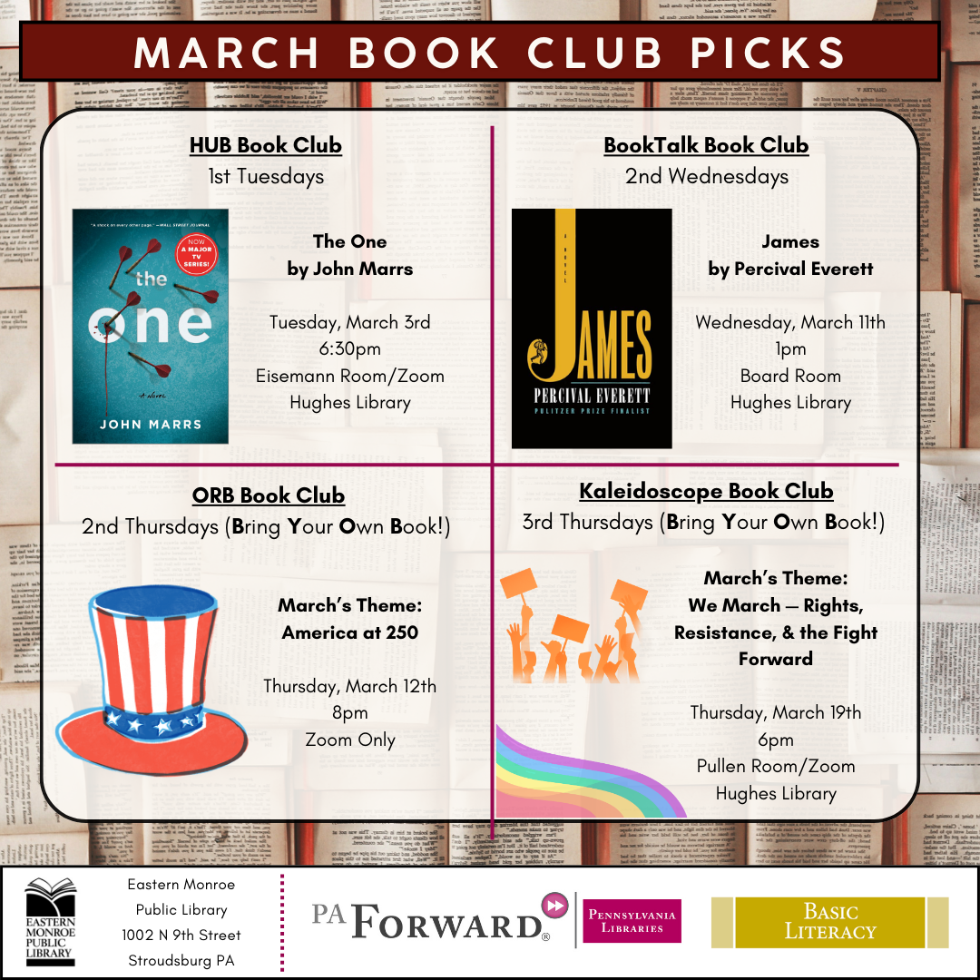 March’s Book: James by Percival Everett. A monthly book club on 2nd Wednesday afternoons! Monthly title selections are available through the EMPL catalog. Some copies may also be available through Libby and Hoopla. Call 570-421-0800 x311 and ask for Jason, or email jvigorito@monroepl.org for more information.