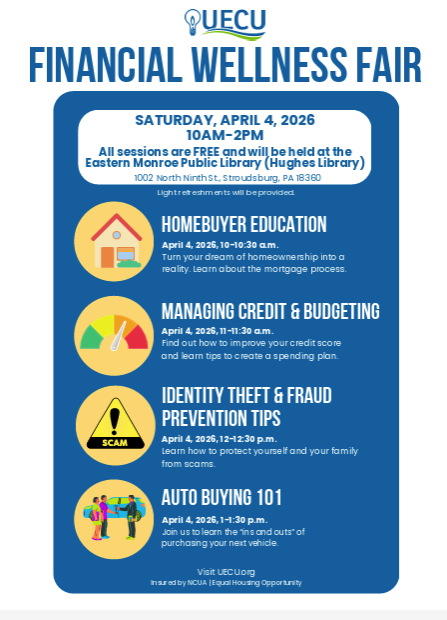 Take charge of your financial future at the Financial Wellness Fair. Free, drop-in event. 30-minute in-person financial education sessions throughout the day. Topics include Budgeting & Managing Credit, Identity Theft and Fraud Prevention, Auto Buying 101, and Homebuyer Education. No registration required. Light refreshments provided. In partnership with UECU (formerly NEPAFCU). More info and session times available by calling the Reference Desk at 570-421-0800 x.317.